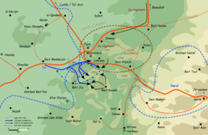 - ستلتف الكتيبة 72 حول موقع الجنوب لتلتقي بطريق القدس عند مستوى باب الواد. ثم تعبر الطريق وتسلق التلال للاستيلاء على دير أيوب ويالو وبيت نوبا، وتنصب كمينًا هناك لتغطية مرور القوافل. سيتم دعمها بثلاث عربات مدرعة وعربتين نصف نقل للكتيبة 73.[30]