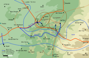 في 8 مايو، أطلقت الهاگاناه العملية مكابي ضد جيش الإنقاذ العربي والمقاتلين الفلسطينيين غير النظاميين الذين سيطروا على عدة قرى على امتداد طريق القدس ومنعوا إعادة إمداد الجالية اليهودية في القدس. انخرط لواء گڤعاتي (على الجانب الغربي) و لواء هارئيل (على الجانب الشرقي) في القتال، لا سيما في منطقة اللطرون.[12][14]
