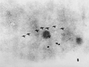 قنابل من مقاتلة يابانية تسقط بالقرب من the Dutch light cruiser Java في مضيق گاسپار شرق سومطرة، جزر الهند الشرقية الهولندية، في 15 فبراير 1942. | |||||||