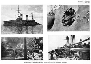 The battleship Sissoi Veliky was badly damaged by a torpedo in the stern and was scuttled the next day. Two old armoured cruisers – Admiral Nakhimov and Vladimir Monomakh – were badly damaged, the former by a torpedo hit to the bow, the latter by colliding with a Japanese destroyer. They were both scuttled by their crews the next morning off Tsushima Island, where they headed while taking on water.[46] The night attacks placed a great strain on the Russians, as they lost two battleships and two armoured cruisers, while the Japanese lost only three torpedo boats.[47]