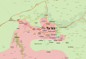 Map of the siege of Taiz within southwestern Yemen as of Spring 2017.