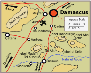 في 8 يونيو 1941 هاجمت فيالق هندية من المجموعة الخامسة في الجيش البريطاني كلاً من درعا والقنيطرة وسيطرت عليها قادمة من منطقة الانتداب البريطاني على شرق الأردن، وذلك لفتح الطريق لقوات فرنسا الحرة للسيطرة على دمشق العاصمة، وقد وضع خطة المعركة قائد قوات الحلفاء الحاكم العام ويلسون ميتلاند. في 17 يونيو وقعت معارك عنيفة في الكسوة التابعة لريف دمشق، اضطرت قوات حكومة ڤيشي للتراجع نها في اليوم ذاته. التقهقر من قبل قوات الحلفاء كان قد تم في اليوم السابق، حين تمكنت قوات حكومة ڤيشي من السيطرة مجددًا على القنيطرة، ما يمثل تهديدًا لقطع الاتصالات والإمدادات بين قوات الحلفاء وعمقها في الأردن. رغم ذلك، قررت القوات المتواجدة في ريف دمشق الهجوم على المدينة دون انتظار استعادة القنيطرة.