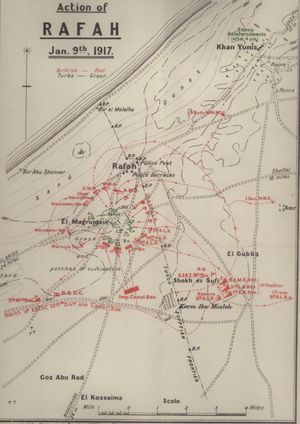 The plan for the attack at Rafa the next morning, 9 January, was a repetition of Chauvel's successful encirclement attack في مغضبة. The regiments and motor cars would surround the Ottoman garrison position, gallop up under fire, then dismount to attack the defenders, in their treble system of trenches and field-works around the earthwork redoubts on the knoll.[6]