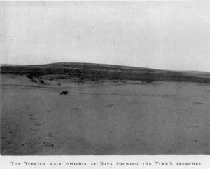 رفح كانت يدافع عنها الفوج 31 مشاة العثماني (الفرقة الثالثة) مدعومة من بطارية مدفعية جبلية واحدة.[15] It had been reported by British aerial reconnaissance that this force was between 2,000 and 3,000 strong.[14] They were strongly entrenched in four main positions on the high ground about Hill 255, وتُعرف بإسم المقرونتين. The central redoubt, which rose about 200 أقدام (61 m) above to dominate the surrounding grassland, was supported by three systems of redoubts identified as A, B and C systems. These redoubts were linked and supported by trenches on the slopes spreading out towards the south-east, south and south-west. The strong, well prepared and well sited redoubts and trench systems provided all-round defence with a clear view of a battlefield devoid of cover for some 2،000 ياردة (1،800 m). The only slight weakness was to the rear of the position in the north-east.[16][17][18]