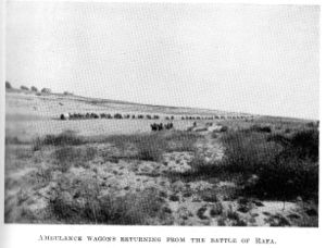 The Turkish held off, but it was not until early next morning that, on the arrival of the 3rd Light Horse Brigade at Sheikh Zowaiid, the Welsh ambulance convoy received orders to return to Magruntein. At 8 a.m. the wounded were sent to Sheikh Zowaiid, and early the same afternoon all the sandcarts of the 52nd Division arrived from El Arish and evacuated them to the receiving station there. Some of these sandcarts went out close to Rafa to bring in a number of wounded Turks who had been missed, and arrived back at Sheikh Zowaiid at 5.30 a.m. on January 11 without molestation, although the rearguard had come in. After treatment and a night’s rest at Sheikh Zowaiid the remainder of the wounded were evacuated in the 1st Light Horse Field Ambulance transport and two Welsh ambulance convoys to El Arish, where they arrived at 6 p.m. Thence they were taken away to Kantara on January 12 by ambulance train, which now came within three miles of El Arish.
