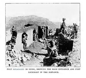 معركة سرگرهي Battle of Saragarhi كانت last-stand battle fought before the Tirah Campaign between the British Indian Empire and Afghan tribesmen.[8] On 12 September 1897, an estimated 12,000 – 24,000 Orakzai and Afridi tribesmen were seen near Gogra, at Samana Suk, and around Saragarhi, cutting off Fort Gulistan from Fort Lockhart. The Afghans attacked the outpost of Saragarhi where thousands of them swarmed and surrounded the fort, preparing to assault it.[9] Led by Havildar Ishar Singh, the 21 soldiers in the fort—all of whom were Sikhs—refused to surrender and were wiped out in a last stand. The post was recaptured two days later by another British Indian contingent.