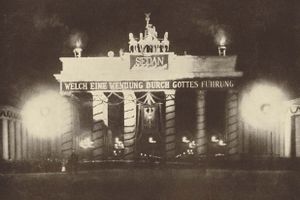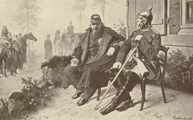 معركة سيدان Battle of Sedan معركة وقعت خلال الحرب الفرنسية الپروسية بين الجيش البروسي والجيش الفرنسي في 1 سبتمبر 1870. أسفرت عن القاء القبض على الامبراطور نابليون الثالث. كان الألمان دحروا الفرنسيين بعدة معارك فرعية صغيرة. وكانت هذه المعركة الحد الفاصل، فقد خطط بسمارك لهذه الحرب مع أركان جيشه وعلى رأسهم (مولتكة) منذ هزيمتهم للنمسا، بينما اعتمد الفرنسيون على أمجادهم وسمعة جيشهم. وكان (مولتكة) قد قسم قواته إلى ثلاثة جيوش لتتقدم في ثلاثة محاور وتلتقي في باريس. واستخدم الألمان المخترعات الحديثة في الحرب. فالسكك الحديدية لنقل الجنود، والأسلاك البرقية لإصدار الأوامر، ووضعوا المؤن والذخيرة في كل قرية باتجاه الحدود. اتجه الجيش الفرنسي بقيادة المارشال باتريس ماكماهون ويرافقه الامبراطور نابليون الثالث في مهمة رفع الحصار عن متز ، وارتكب القائد الفرنسي ماكماهون عدة أخطاء عسكرية، كبدت جيشه خسائر فادحة، اضطرته للتراجع إلى سيدان، وهناك استطاع مولتكه أن يحاصر القوات الفرنسية ويسلط عنيها مدافعه. ولم يستسلم الفرنسيون بسهولة، بل اشتدت المعارك وتساقط القتلى من الطرفين. وأخيراً اضطر الإمبراطور نابليون الثالث الموجود بين جنوده المحاصرين أن يأمر ضباطه برفع العلم الأبيض لإنهاء هذه المجازر،وأرسل إلى ملك بروسيا الكتاب التالي:[2]