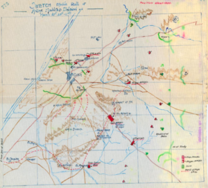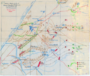 In addition to these natural defences, the Ottoman Army constructed trenches and redoubts that extended from the south west of the town virtually all the way round the town, except for a gap to the north east. In the process they incorporated Ali Muntar into the town entrenchments by building additional defences on the ridge to the south of the town.[38] Although the trenches were only lightly strengthened with barbed wire, those to the south of Gaza commanded bare slopes which were completely devoid of any cover whatsoever.[39]