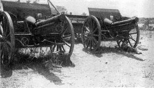 Further reinforcements of between 10,000 and 12,000 soldiers were ordered by Kress von Kressenstein as a result of the 300th Flight Detachment's reports of the EEF's advances towards Gaza. Arriving before Eastern Force made its attack, these reinforcements consisted of the 3rd Infantry Division (31st and 32nd Infantry Regiments) from Jemmame, and the 16th Infantry Division (47th and 48th Infantry Regiments) from Tel esh Sheria.[27][28] They were supported by 12 heavy mountain howitzers in two Austrian batteries, two 10-cm long guns in a German battery (from Pasha I) and two Ottoman field artillery batteries.[27][28]