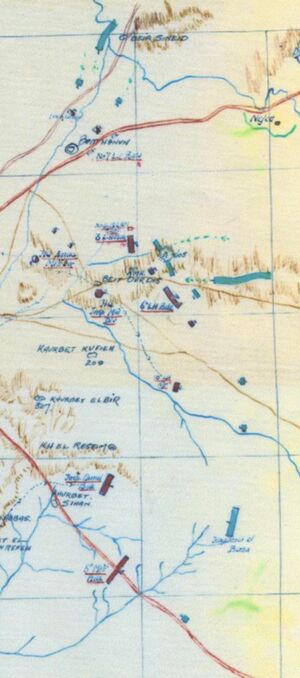 The main Ottoman force of between two and a half and three divisions, estimated between 6,000 and 16,000 rifles, were deployed at Tel el Negile and Huj with detachments at Tel esh Sheria, Jemmameh, Hareira, Beersheba, and Gaza, to prevent the EEF from out-flanking Gaza.[5][42][43] The rear of the EEF was to be attacked by the Ottoman 16th Division, at a point where the road from Khan Yunis to Gaza crossed the Wadi Ghuzze, and by the Beersheba Group which was to advance via Shellal, to attack Khan Yunis.[27]