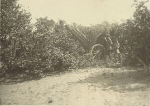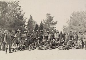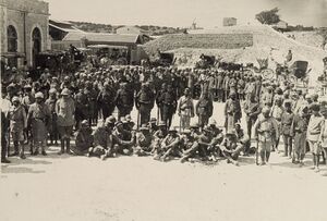 On 28 February, Chetwode's Desert Column occupied Khan Yunis unopposed and the headquarters of the Column was established at Sheikh Zowaiid, while Eastern Force headquarters remained at El Arish.[3] The ancient town of Khan Yunis on the main road to Gaza was said to be the birthplace of Delilah. With bazaars, narrow streets and a castle, it was one of several villages in this fertile area of southern Palestine, 6 ميل (9.7 km) north of Rafa and the Egyptian–Ottoman frontier. Here was found the largest and deepest well in the area, and after engineers had installed a pumping machine, it gave an unlimited supply of water for both men and horses. The village quickly became an important forward site for supply depots and bivouacs.[6][24] Around Khan Yunis gardens, orange orchards, fig plantations and grazing were carried on by the local population, while in the Rafa and Sheikh Zowaiid areas barley and wheat were grown.[6][7][8]