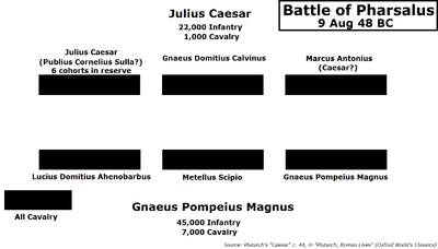 أحرز بومبي النصر في البداية. فعندما التقى الجيشان الخصمان عند فارسالوس (فارسالا حاليًا) في اليونان كان جيش بومبي الذي يزيد على 40,000 رجل يفوق جيش قيصر عددًا. ومع ذلك، فقد صمد جنود قيصر المشاة أمام هجوم العدو، وتقهقر فرسان بومبي في ارتباك، عندها أمر قيصر بشنِّ هجوم مضاد من الجناح، وهو ما حطم جيش بُومْبيِ، وهرب عدد كبير من جنوده واستسلم أكثر من نصف رجاله، بينما خسر جيش قيصر ما يقل عن 250 قتيلاً.