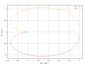 رسم نايكويست. Although the frequencies are not indicated on the curve, it can be inferred that the zero-frequency point is on the right, and the curve spirals toward the origin at high frequency. This is because gain at zero frequency must be purely real (on the X axis) and is commonly non-zero, while most physical processes have some amount of low-pass filtering, so the high-frequency response is zero.