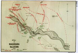 After their retreat from El Arish, the Ottoman garrison withdrew down the Wadi el Arish 25 ميل (40 km) south east of El Arish, to Magdhaba and Abu Aweigila, about another 15 ميل (24 km) further away from the coast, on the banks of the wadi.[32] At Magdhaba the garrison had increased from 500 to about 1,400 Ottoman soldiers; there may have been as many as 2,000, consisting of two battalions of the 80th Infantry Regiment (27th Ottoman Infantry Division but attached to the 3rd Ottoman Infantry Division for most of 1916). These two battalions, the 2nd Battalion, commanded by Izzet Bey, of about 600 men and the 3rd Battalion, commanded by Rushti Bey, were supported by a dismounted camel company and two squads from the 80th Machine Gun Company. (The remainder squads of the 80th Machine Gun Company had been moved north to Shellal.) The defending force was also supported by a battery of four Krupp 7.5 cm Gebirgskanone M 1873 guns (on loan from the 1st Mountain Regiment), since the 80th Regiment's own artillery battery was stationed at Nekhl. Also attached to the Ottoman garrison at Magdhaba were a number of support units, including elements of the 3rd Company of the 8th Engineer Battalion, 27th Medical Company, 43rd Mobile Hospital and the 46th Cooking Unit. The garrison was under the command of Kadri Bey, the commanding officer of the 80th Infantry Regiment.[37][38]