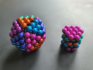 Two objects made of neodymium magnets. The right object has the close-packing of equal spheres.