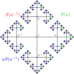 Cayley graph of F2, showing decomposition into the sets S(a) and aS(a−1). Traversing a horizontal edge of the graph in the rightward direction represents left multiplication of an element of F2 by a; traversing a vertical edge of the graph in the upward direction represents left multiplication of an element of F2 by b. Elements of the set S(a) are green dots; elements of the set aS(a−1) are blue dots or red dots with blue border. Red dots with blue border are elements of S(a−1), which is a subset of aS(a−1).