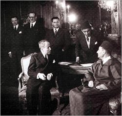 كان المخطط الذي خرجت به مفاوضات إيكس ليبان ينتظر لكسب الشرعية القانونية، المصادقة من طرف سلطان المغرب الشرعي. فمادام أن السلطات الفرنسية قد وقعت معاهدة الحماية مع السلطان في شخص مولاي عبد الحفيظ سنة 1912، فقد كان لزاما عليها من الناحية القانوية أن يتم التفاوض على مبدأ الاستقلال مع سيدي محمد بن يوسف. ففي هذا الإطار استقبل جلالته في يوم 5 سبتمبر 1955 وفدا فرنسيا مفوضا يضم الجنرال كاترو وهنري يريسو، إضافة إلى الوفد المغربي المشكل من السيد مولاي حسن بن إدريس ومبارك البكاي والفاطمي بن سليمان وعبد الهادي بوطالب وعمر عبد الجليل وعبد الرحيم بوعبيد. وجاء هذان الوفدان من إجل إبلاغ السلطان عن النتائج التي توصل إليها الطرفان المتفاوضان والحصول على التعليمات التي يجب اتباعها. وبعد مشاورات طويلة لعب فيها ولي العهد آنذاك مولاي الحسن دورا أساسيا في توجيه الموقف الذي اتخذه سيدي محمد بن يوسف من المخطط، وهوالموافقة على المخطط مع التحفظ بإعلان ضرورة بقاء مجلس العرش مؤقتا إلى حين عودة السلطان إلى أرض الوطن.