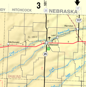 - ^ أ ب "General Highway Map of Rawlins County, Kansas" (PDF). Kansas Department of Transportation (KDOT). يوليو 2009. Archived (PDF) from the original on فبراير 7, 2023.