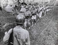 After Bataan and Corregidor, many who escaped the Japanese reorganized in the mountains as guerrillas still loyal to the U.S. Army Forces Far East (USAFFE). One example would be the unit of Ramon Magsaysay in Zambales, which first served as a supply and intelligence unit. After the surrender in May 1942, Magsaysay and his unit formed a guerrilla force which grew to a 10,000-man force by the end of the war.[28] Another was the Hunters ROTC which operated in the Southern Luzon area, mainly near Manila. It was created upon dissolution of the Philippine Military Academy in the beginning days of the war. Cadet Terry Adivoso refused to simply go home as cadets were ordered to do, and began recruiting fighters willing to undertake guerrilla action against the Japanese.[29][30] This force would later be instrumental, providing intelligence to the liberating forces led by General Douglas MacArthur, and took an active role in numerous battles, such as the Raid at Los Baños. When war broke out in the Philippines, some 300 Philippine Military Academy and ROTC cadets, unable to join the USAFFE units because of their youth, banded together in a common desire to contribute to the war effort throughout the Bataan campaign. The Hunters originally conducted operations with another guerrilla group known as the Marking Guerrillas, with whom they went about liquidating Japanese spies. Led by Miguel Ver, a PMA cadet, the Hunters raided the enemy-occupied Union College in Manila and seized 130 Enfield rifles.[31]