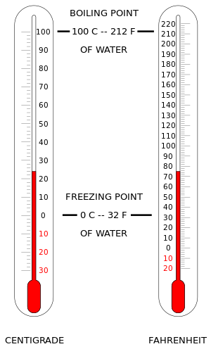 يتجمد الماء في التدريج المئوي عند درجة حرارة الصفر، ويغلي عند درجة الحرارة 100°م. ويستخدم مقياس كلفن للقياس في الأغراض العلمية، ويتجمد الماء في هذا المقياس عند درجة حرارة 273ك ويغلي عند درجة حرارة 373ك. بينما يتجمد في التدريج الفهرنهيتي عند درجة 32°ف ويغلي عند درجة 212°ف. انظر: الأوزان والمقاييس.