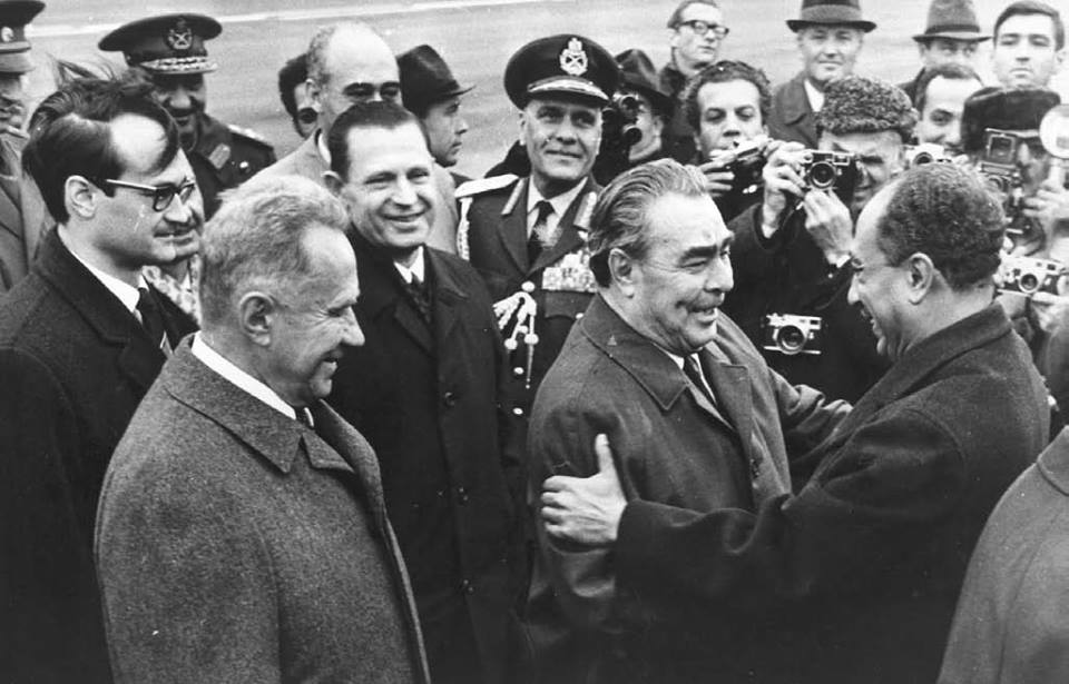 أنور السادات يستقبله ليونيد بريجنيڤ والنائب الأول لرئيس الوزراء دميتري پوليانسكي ورئيس الوزراء ألكسي كوسيگن، في 1971.