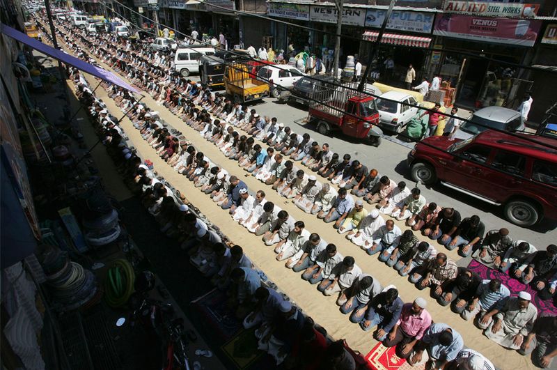 مسلمون يؤدون الصلاة في سريناگار، جامو وكشمير، كشمير الهندية، 24 أغسطس، 2009. |