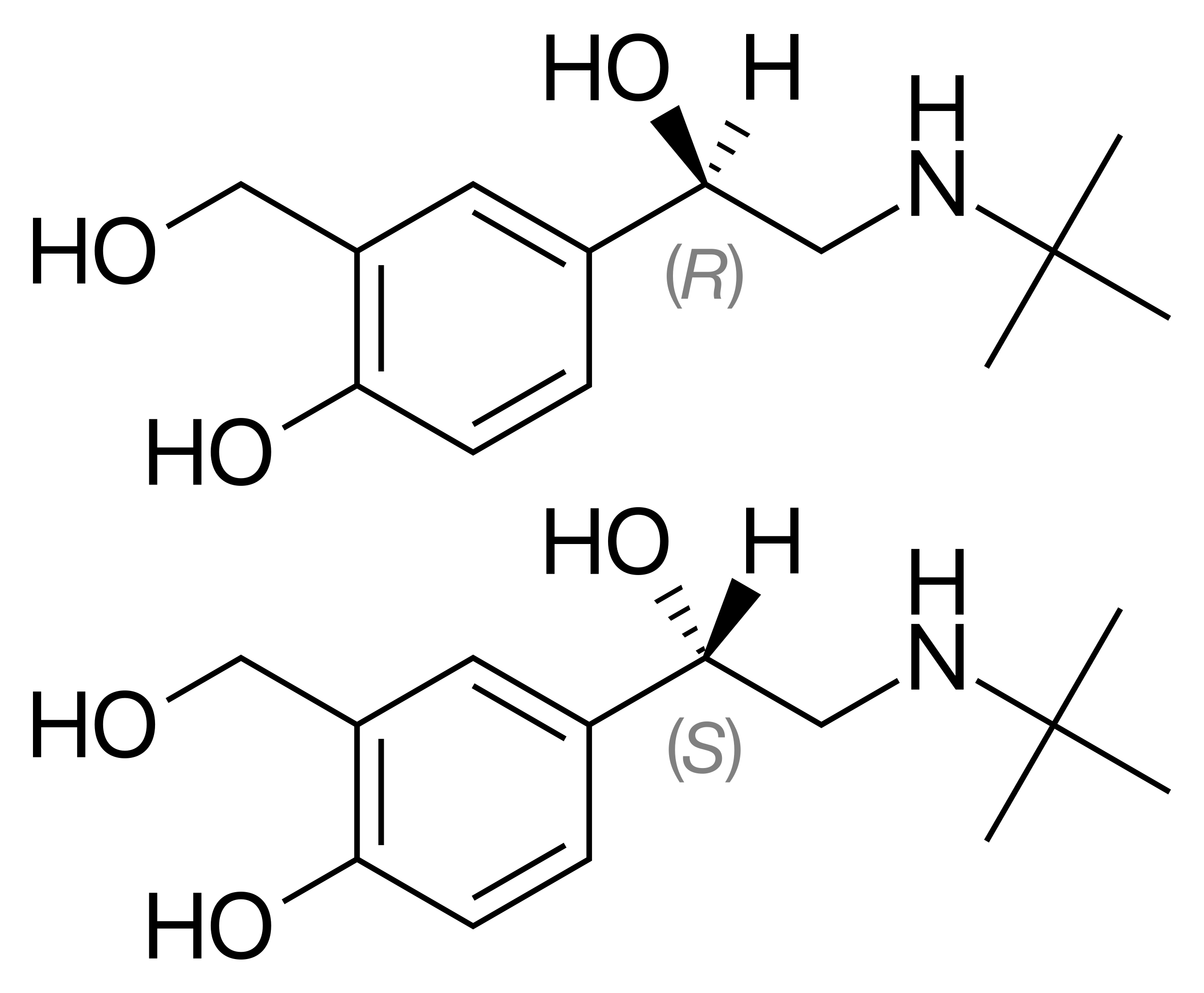English: Skeletal formulae of (R)-(−)- and (S)-(+)-enantiomers of salbutamol (albuterol) — a short-acting β2 agonist used in the treatment of asthma and COPD. Created with ChemDoodle 7.0.2 and Adobe Illustrator CC 2015.