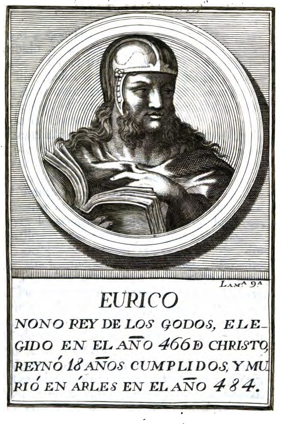 Español: Retrato de EURICO, rey visigodo con el n° 9 en el orden cronológico del libro digitalizado por Google desde la librería de la Universidad de Oxford.