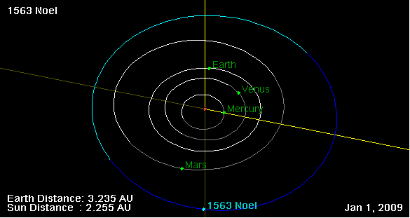 English: 1563 Noël orbit, and his position on 01 Jan 2009 (NASA Orbit Viewer applet)