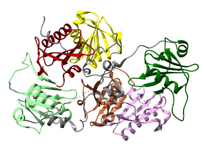 English: Render of cellular form of human Gelsolin from PDB entry 3FFN. Domains 1-6 are colored red, sea green, yellow, lavender, dark green, and brown respectively
