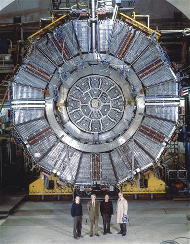English: For detecting the direction and momenta of charged particles with extreme accuracy, the ALEPH detector had at its core a time projection chamber, for years the world's largest. In the foreground from the left, Jacques Lefrancois, Jack Steinberger, Lorenzo Foa and Pierre Lazeyras. ALEPH was an experiment on the LEP accelerator, which studied high-energy collisions between electrons and positrons from 1989 to 2000.