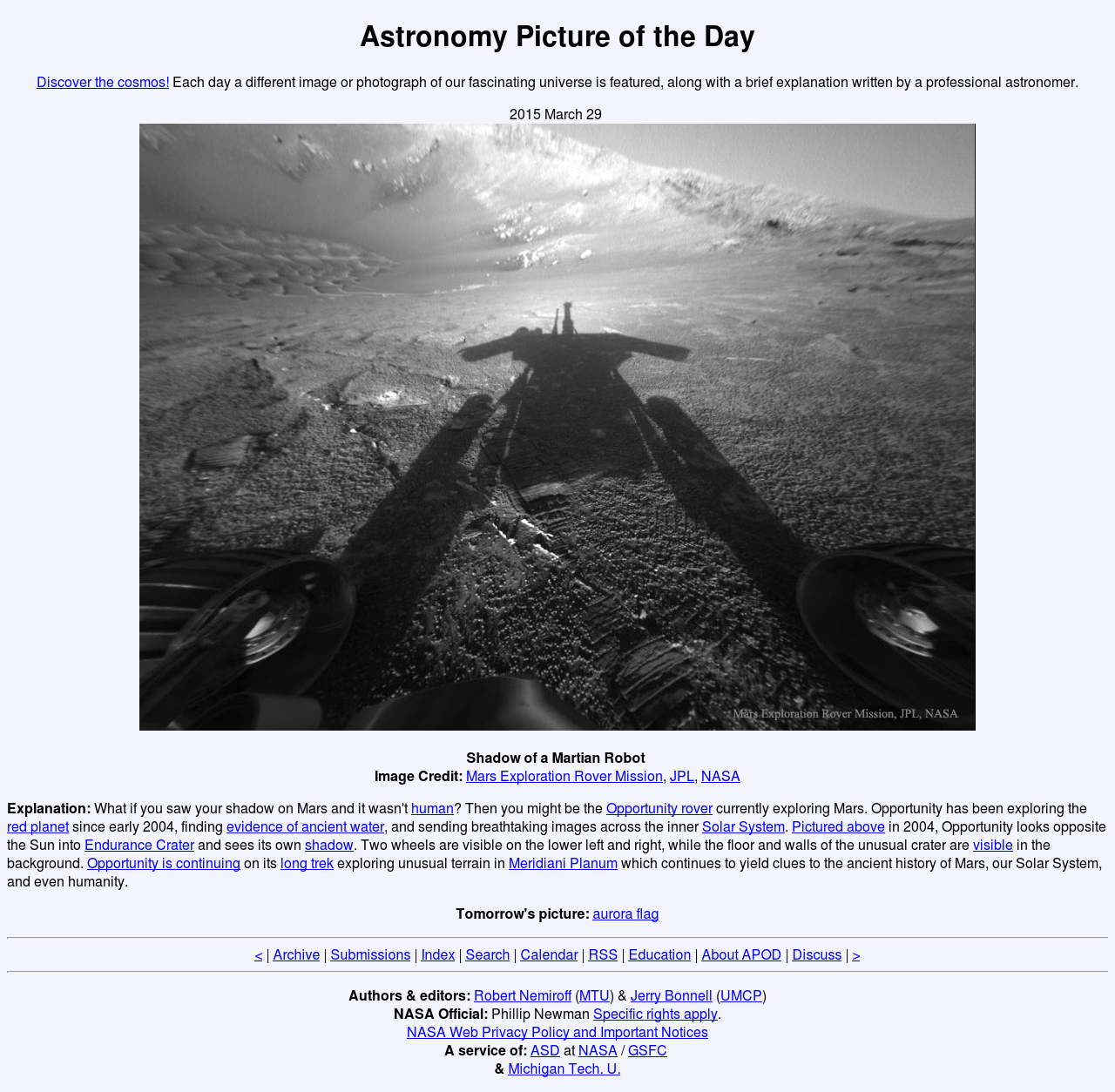 English: An image of the Astronomy Picture of the Day featuring an image of the Opportunity rover. Image created by NASA; site a product of NASA.