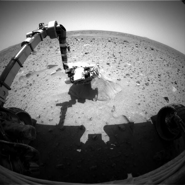 English: Left Front Hazard Camera Non-linearized Full frame EDR acquired on Sol 30 of Spirit's mission to Gusev Crater at approximately 12:05:30 Mars local solar time.