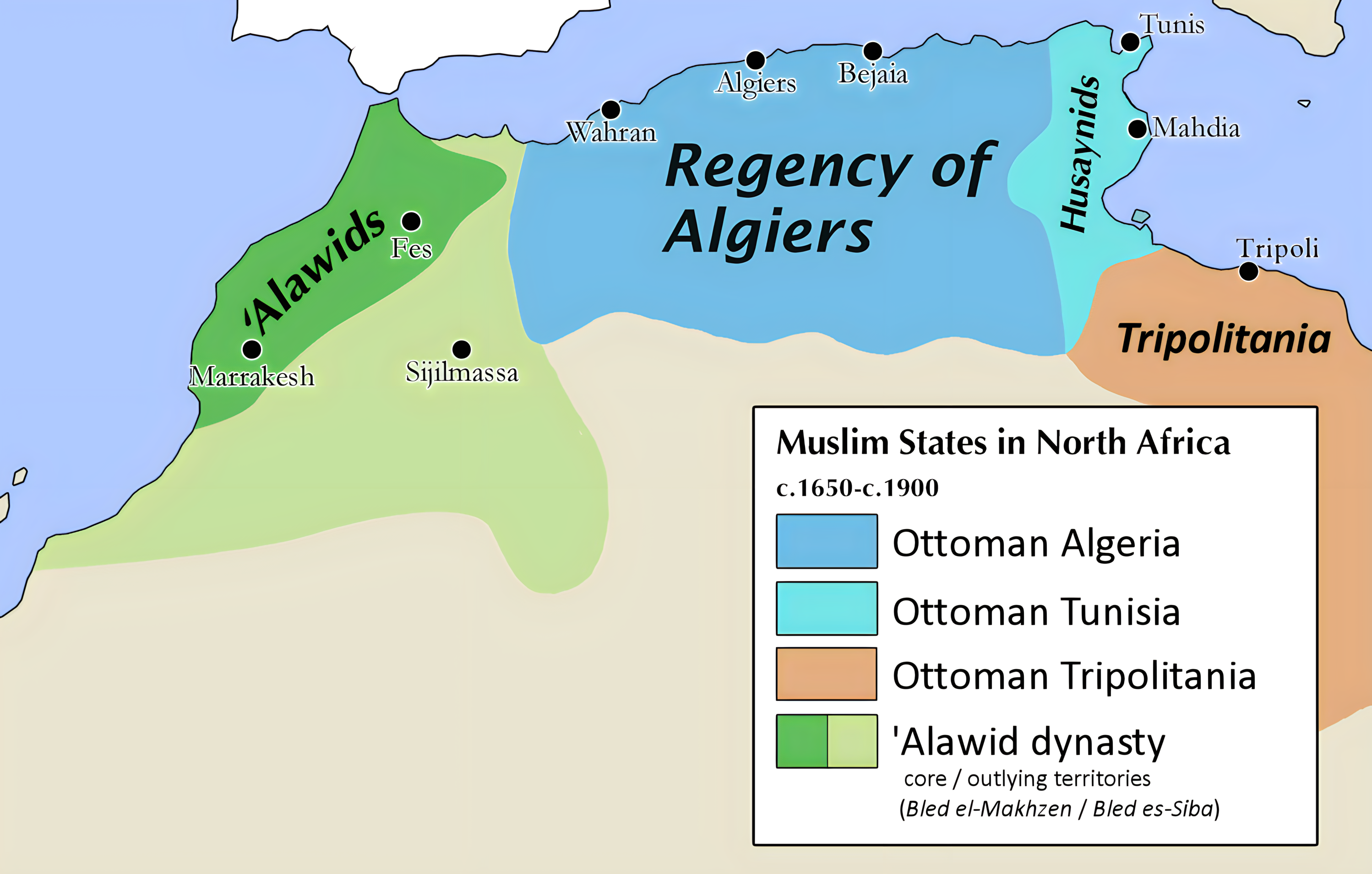 English: General extent of Alawid territorial control and the territories of the Ottoman regencies in North Africa during the 17th to 19th centuries.