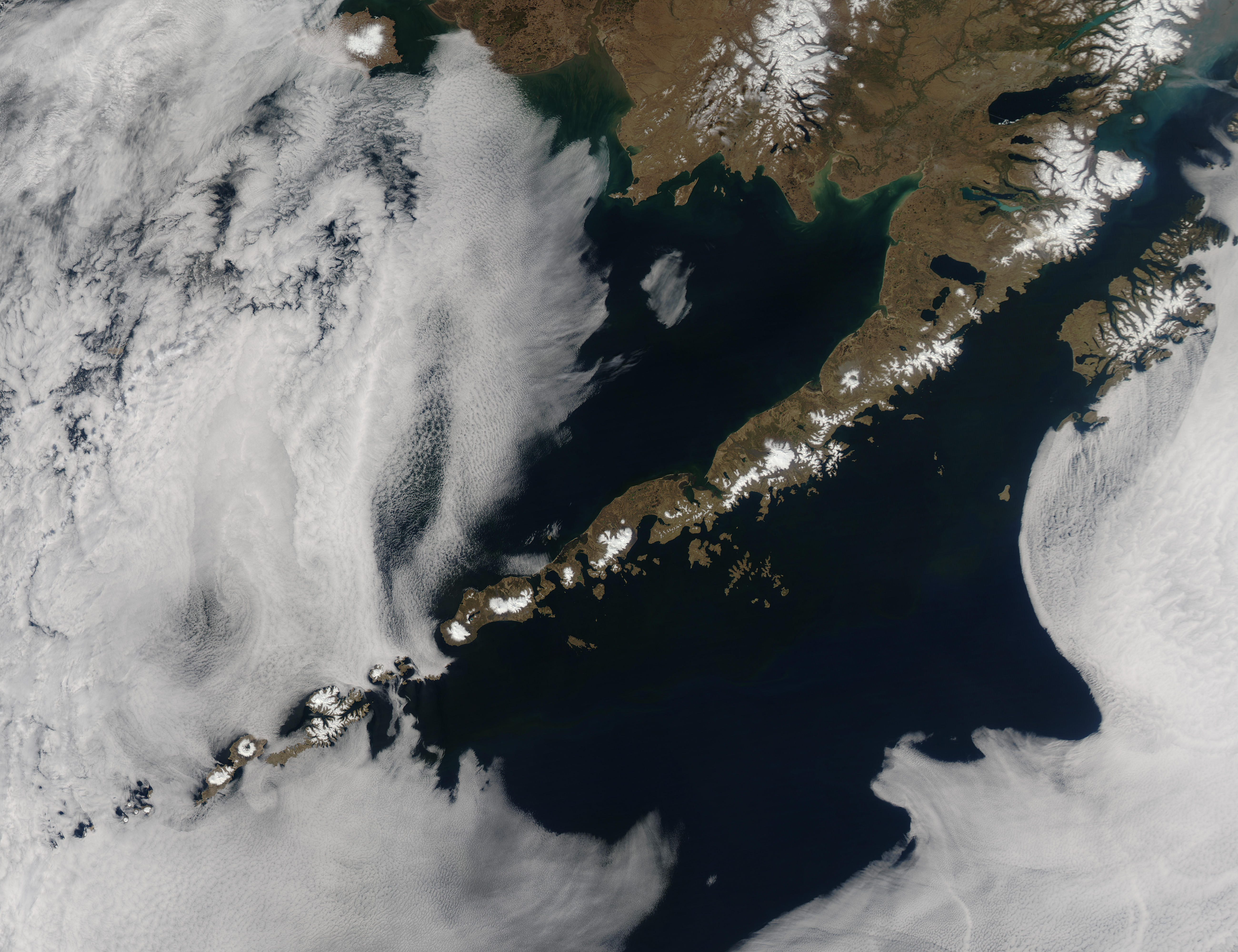 English: Unusually clear skies allowed the Moderate Resolution Imaging Spectroradiometer (MODIS) on NASA’s Aqua satellite to acquire this image of Aleutian Islands on May 15, 2014. Including the Alaskan peninsula, 52 volcanoes are visible in this scene.