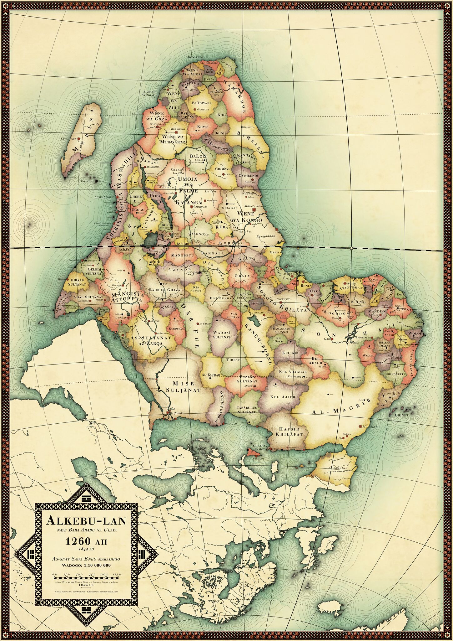 ألكبو-لان (أرض السود): خريطة للوحدات السياسية والقبلية في أفريقيا سنة 1240 هـ/1844م. رسمها الفنان السويدي نيكولاي سيون.[1]