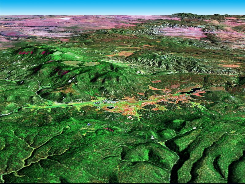 This perspective image was created by joining Landsat 7 data and Digital Elevation Model (DEM) data. The Landsat 7 image was acquired on September 12, 2000 and combines ETM+ spectral bands 7, 4, and 2 as well as the panchromatic band.