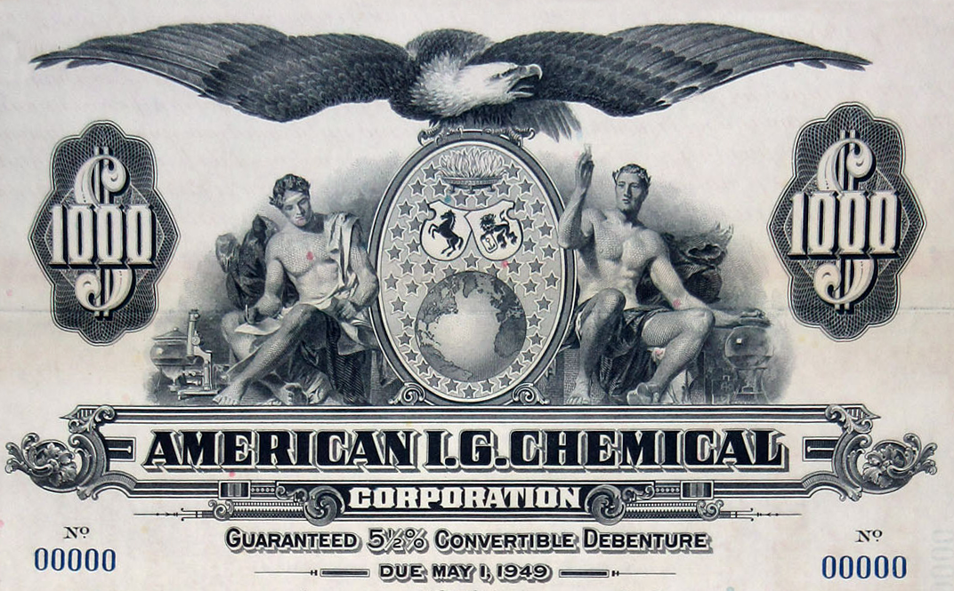 1929 American IG Chemical Corporation debenture (unsecured bond). On March 11, 1942, the United States Government took control of all Nazi Germany-related assets in the country including American IG, since the company was an affiliate of IG Farbenindustrie. |