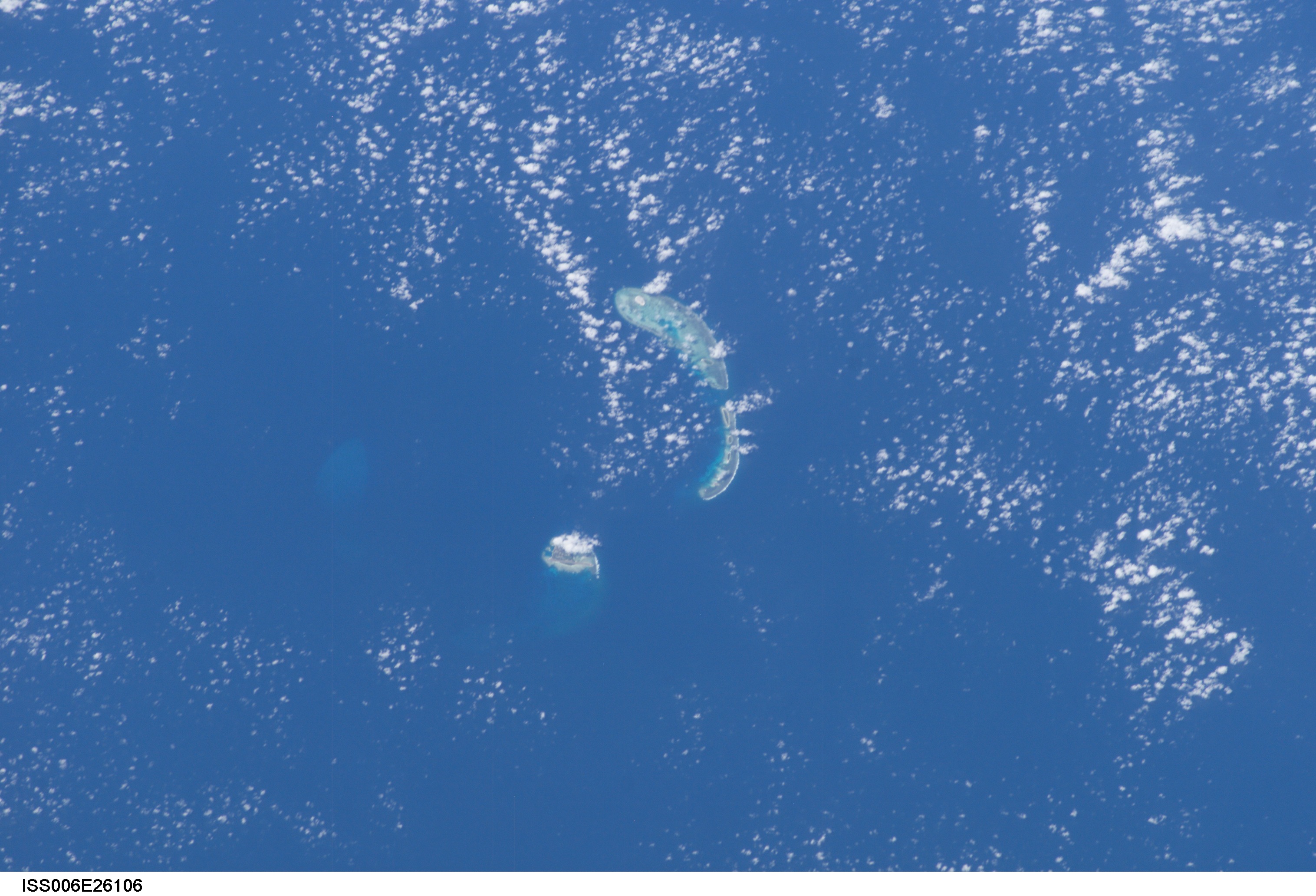 English: Photograph from the International Space Station of the South China Sea which includes the Anphitrite Group and Woody Island features.