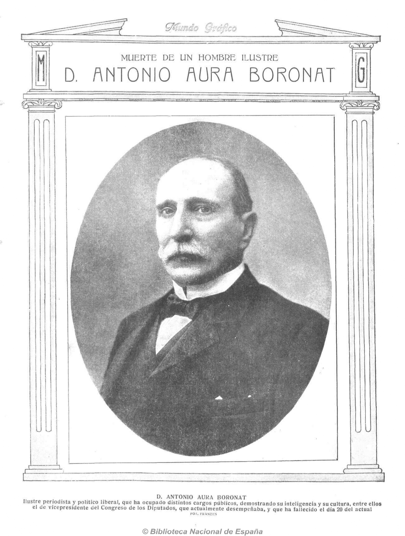 Español: Retrato de Antonio Aura Boronat (político español que fue vicepresidente del Congreso de los Diputados, fallecido el 20 de diciembre de 1922), obra del fotógrafo Christian Franzen, recogido en la revista española es:Mundo Gráfico.