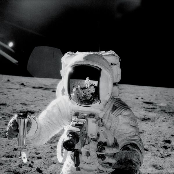 Apollo 12 astronaut Alan Bean holds a special environmental sample container which holds soil collected during the second moonwalk EVA. Commander Charles "Pete" Conrad had just put a soil sample in the tube with a shovel. The picture was taken in the vicinity of Sharp Crater. Conrad took the photograph and can be seen in the reflection in Bean's visor. (Apollo 12, AS12-H-49-7278) |