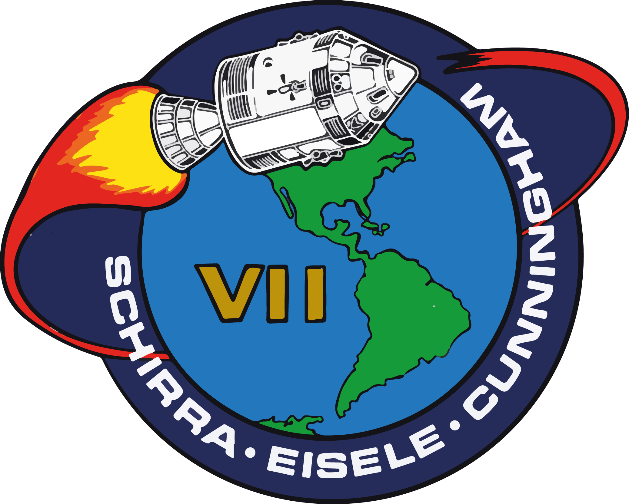 English: The official emblem of Apollo 7, the first manned Apollo space mission. The crew will consist of astronauts Walter M. Schirra Jr., Donn F. Eisele, and Walter Cunningham.