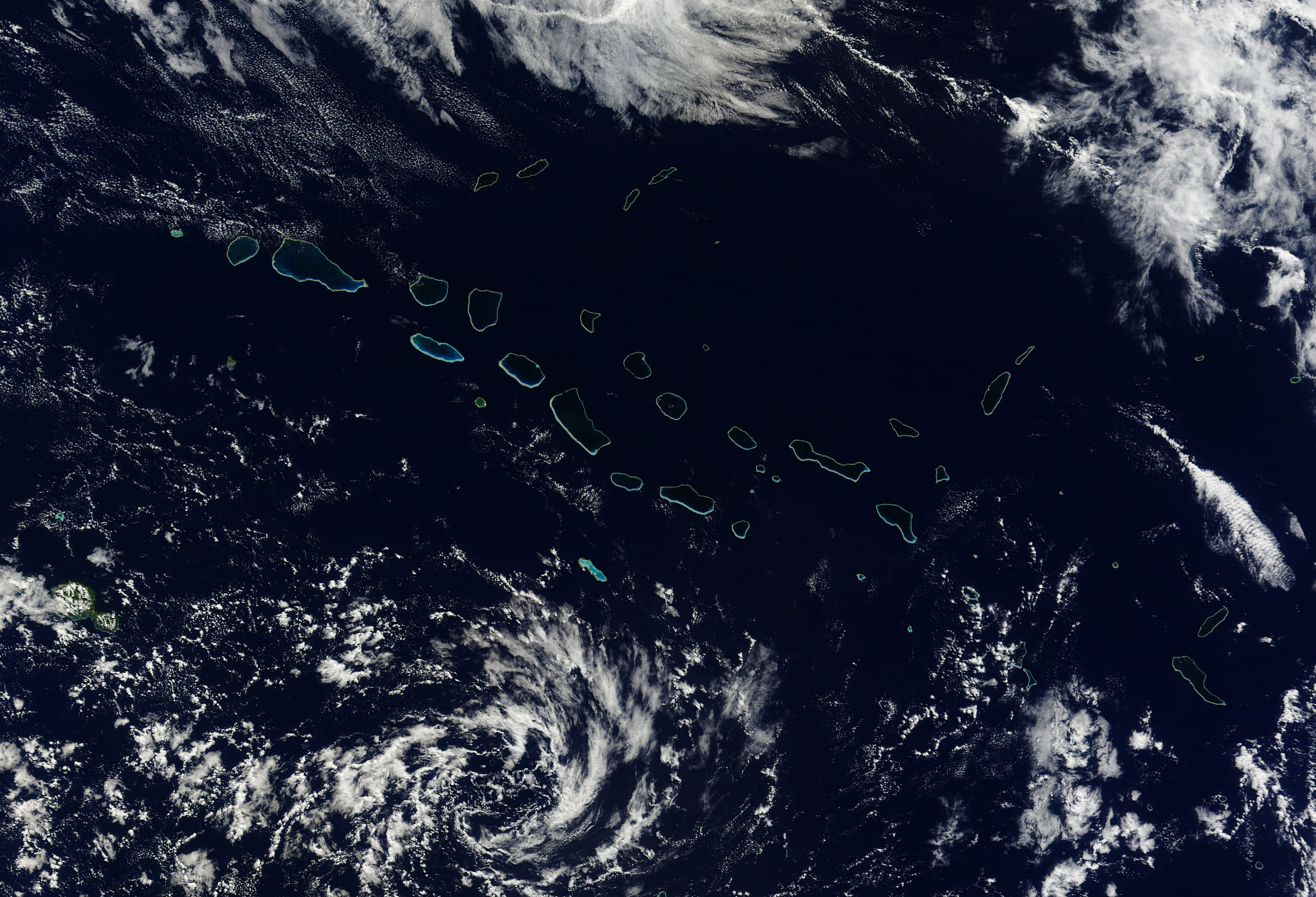 English: Natural-colour image of the north-western portion of the archipelago, including the largest coral atoll in the group, Rangiroa. Delicate rings of iridescent blue-green surround deep blue waters and clouds float overhead. At the north-western extent of the island chain—including islands shown in this image—rocks date to roughly 65 million years ago.