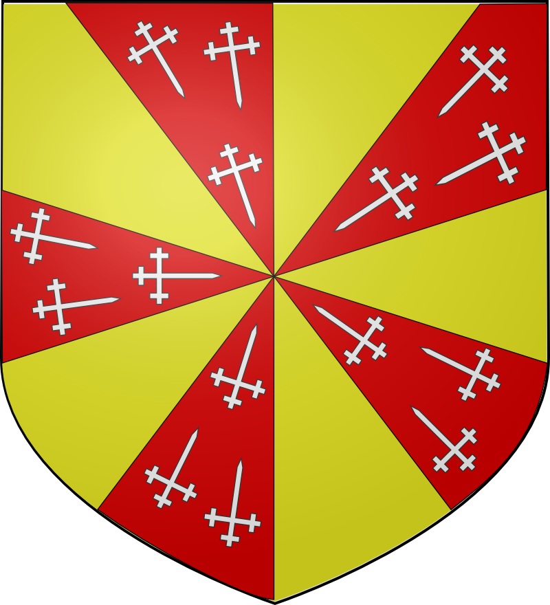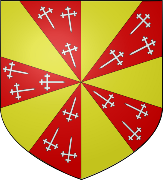 Français : Gironné d’or et de gueules de 10 pièces, chaque giron de gueules chargé de croix recroisettées, au pied fiché d’argent.