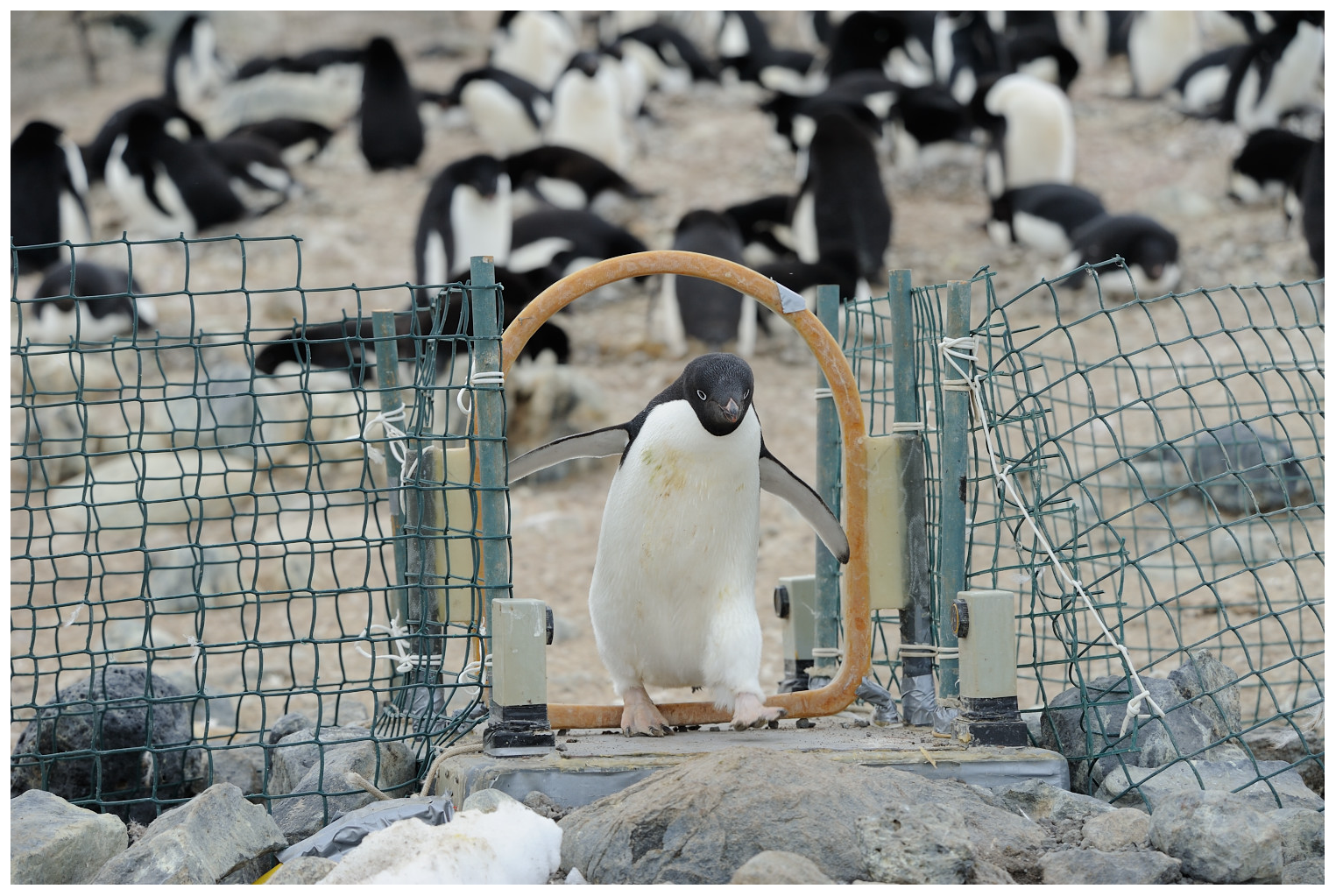 English: Adélie penguins are identified and weighed each time they cross the automated weighbridge on their way to/from the sea.