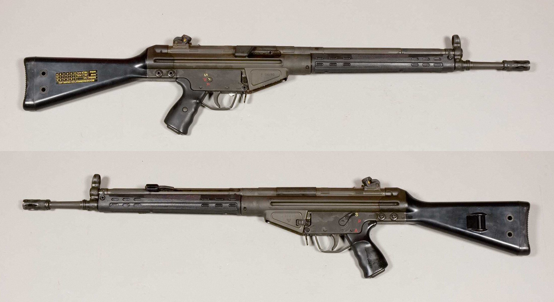 English: Automatkarbin 4 (Heckler & Koch G3 made under license in Sweden by Carl Gustafs). Caliber 7.62mm NATO. Notice the windage table on the butt stock for correctly adjusting a Hensoldt 4x24 telescopic sight for 100–600 متر (109–656 yd) in 100 متر (109 yd) increments. From the collections of Armémuseum (Swedish Army Museum), Stockholm.