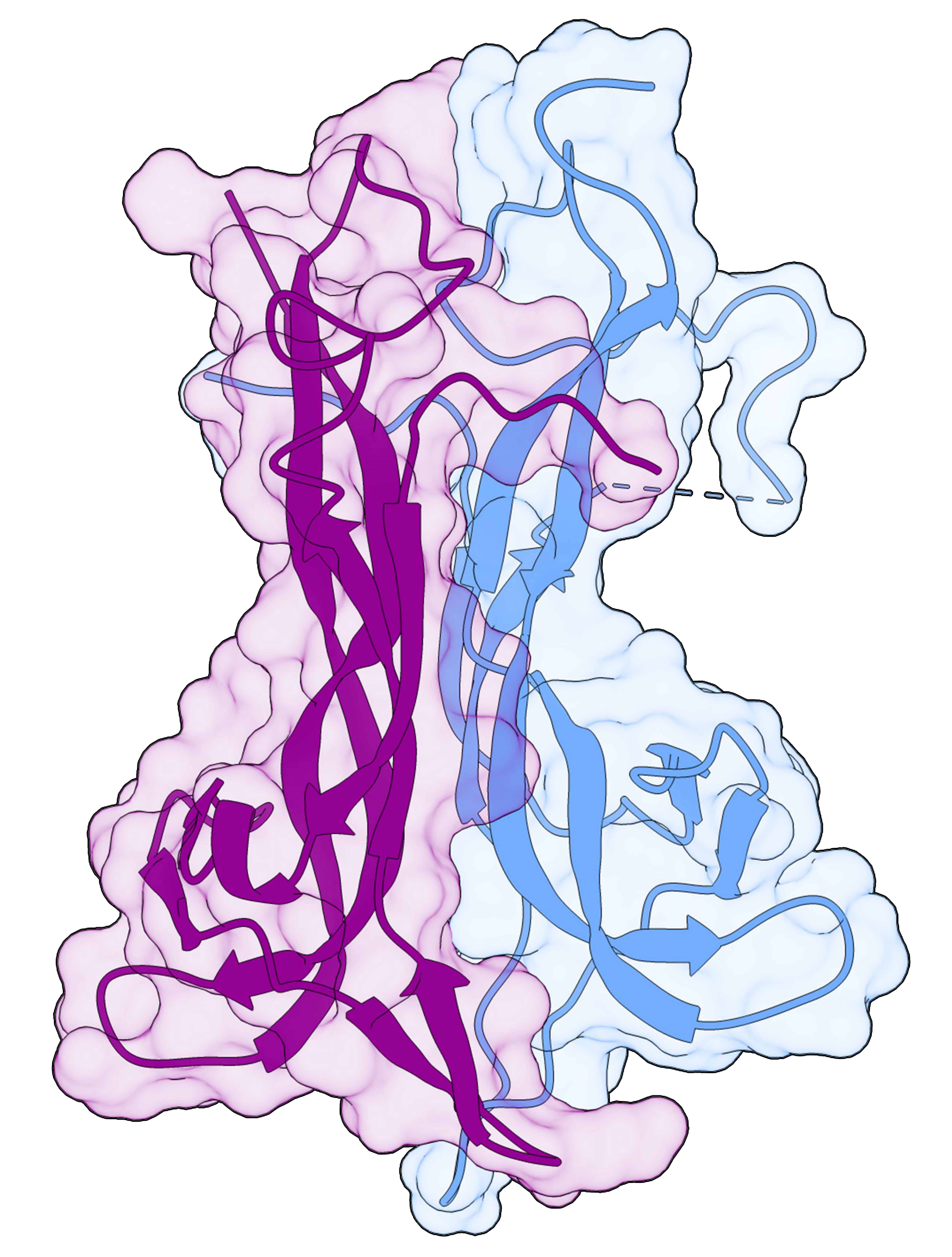 English: Brain-derived neurotrophic factor (violet) and NT-4 heterodimer (blue). This file is created from PDB file 1B8M and rendered with ChimeraX.