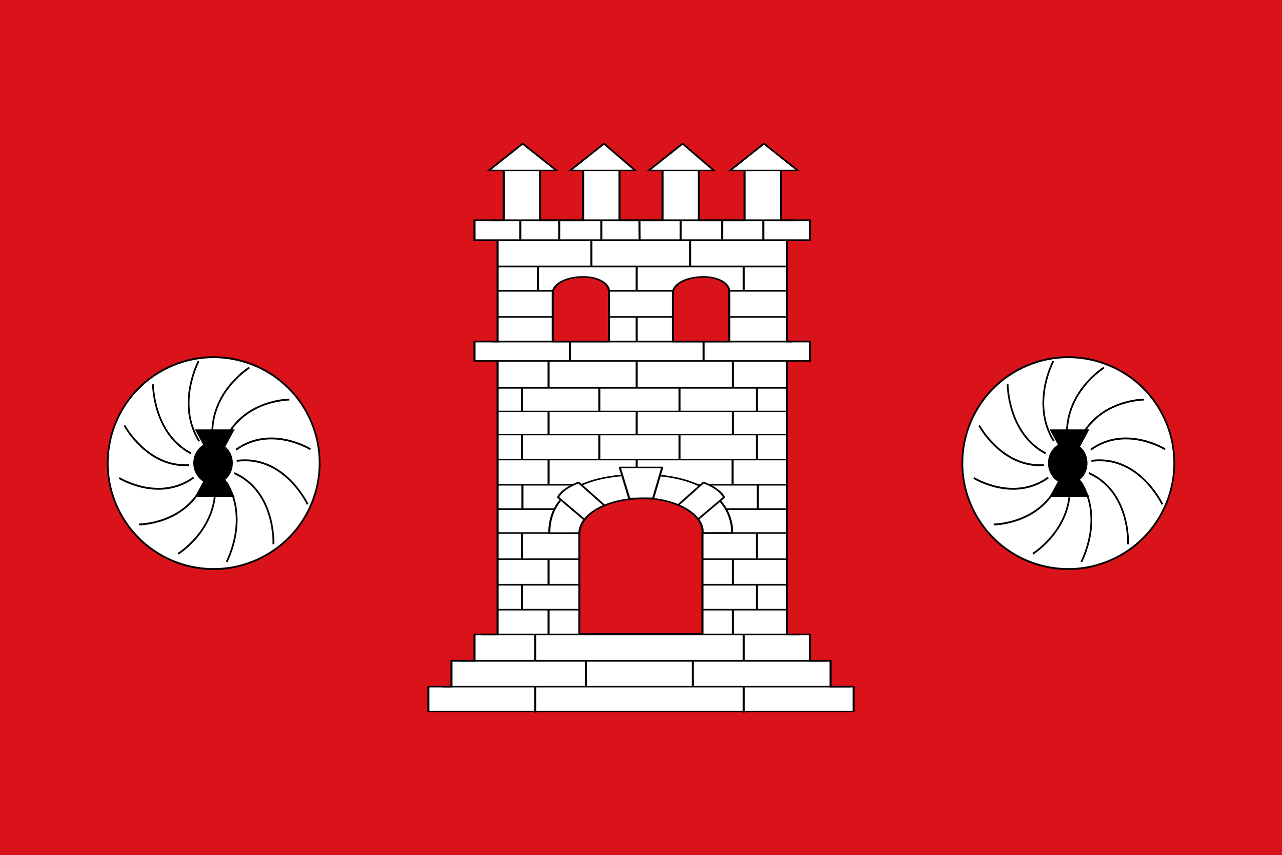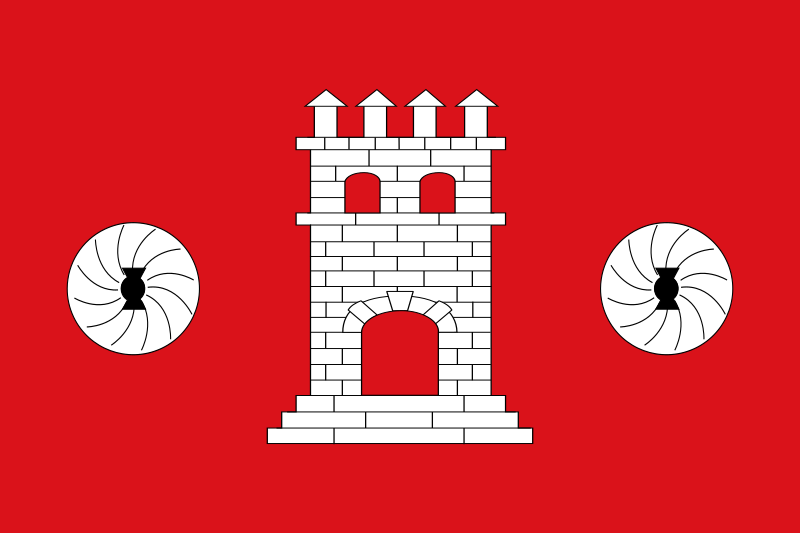 Español: Bandera de Bellaguarda, Lérida, España. Bandera de proporciones 2:3, roja, con la torre blanca, de puerta y ventanas rojas, del escudo, de altura 2/3 de la del paño y anchura 1/3 de la largura del mismo paño, en el centro, y con las dos muelas blancas, con el palahierro negro, del escudo, cada una de diámetro 1/4 de la altura del paño, puestas a 1/3 del borde inferior, la primera a 1/12 del borde del asta y la segunda a la misma distancia de la del vuelo.[2]