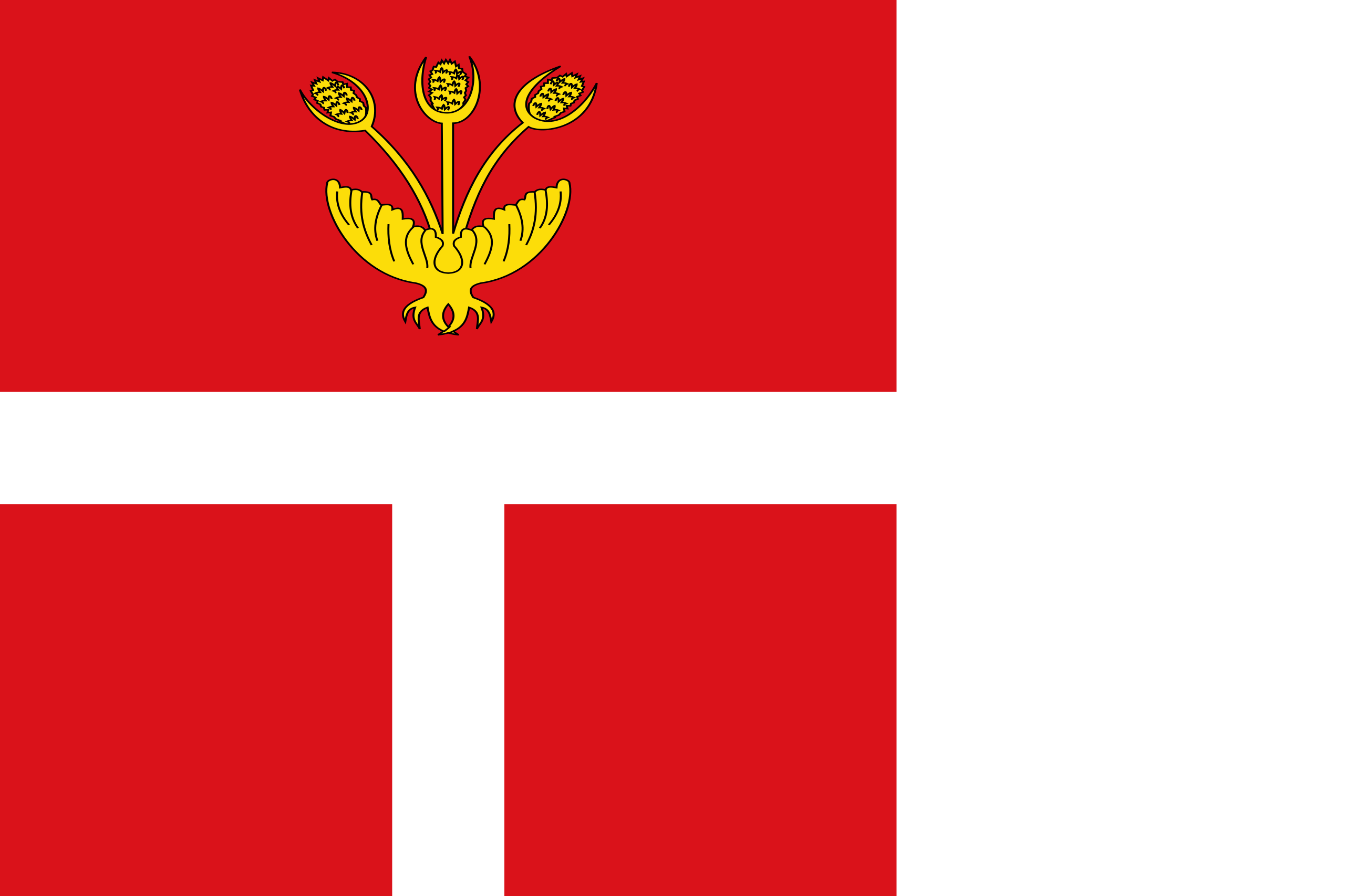 Español: Bandera de Canalda, Lérida, España. Bandera de proporciones 2:3, roja, con el último tercio vertical blanco; en los dos tercios primeros la faja-semipalo blanca del escudo, de grueso 1/8 de la altura del paño, en el centro y el cardo de tres flores amarillo del escudo, de altura 5/16 de la del paño y anchura 2/9 de la largura del mismo paño, en el centro y a 1/16 del borde superior.[2]