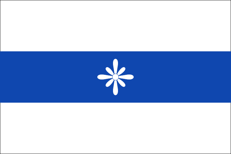 Bandera rectangular de proporciones 2:3, formada por tres franjas horizontales iguales, siendo las exteriores blancas y azul la central, cargada ésta con una flor de las nieves blanca. Referencia: B.O.J.A. nº 146 de 28/07/2005 |